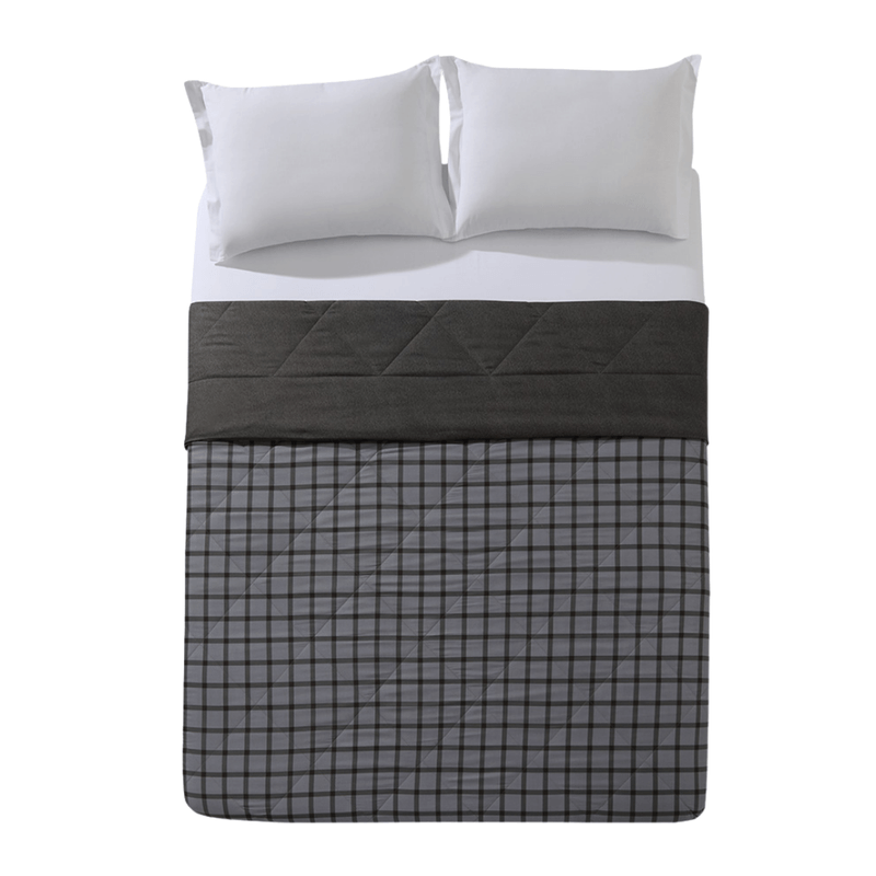 Seu acabamento matelassado confere um visual elegante e sofisticado à peça. A característica dupla face oferece versatilidade com duas opções de visual que se adaptam perfeitamente à sua decoração: a estampa George, um moderno padrão quadriculado na frente, e o verso unicolor que traz um toque extra de leveza e tranquilidade para o ambiente.