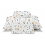O conjunto é composto por três peças fundamentais: um sobre lençol estampado, um lençol com elástico para ajuste perfeito ao colchão e uma fronha coordenada. É o equilíbrio perfeito entre a praticidade que os pais precisam e o aconchego que os pequenos aventureiros merecem, garantindo um enxoval sofisticado e duradouro.