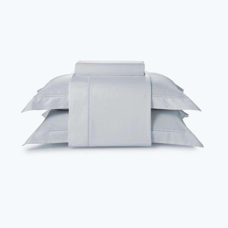 O conjunto Olímpia se destaca pela durabilidade do fio penteado e pela maciez do percal. Os acabamentos, como o bordado e a pala no lençol, dão o toque de elegância perfeito.