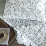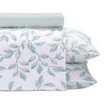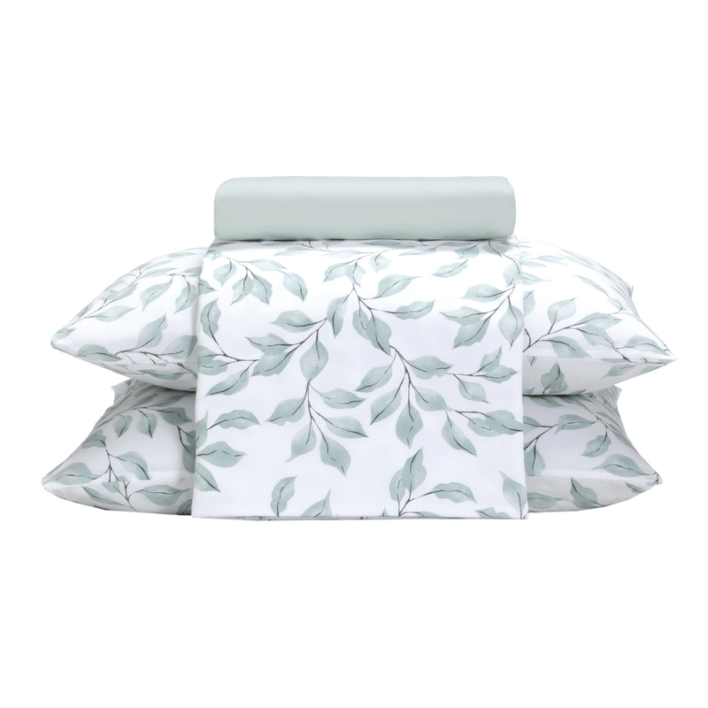 A estampa Valesca apresenta um padrão botânico e delicado de folhas e ramos verdes em aquarela, dispostos elegantemente sobre um fundo claro. O estilo Provença confere uma sensação fresca e calma, ideal para embalar o seu sono em sua cama Queen.