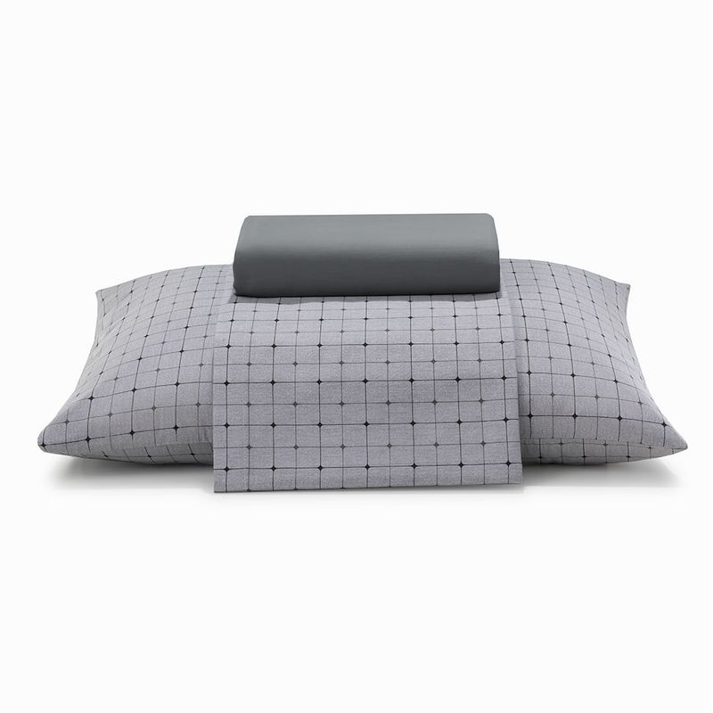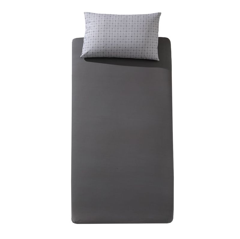 Embalagem composta por: 1 (um) sobre lençol de 140cm x 250cm, 1 (um) lençol de 90cm x 200cm x 35cm e 2 (duas) fronhas de 70cm x 50cm.