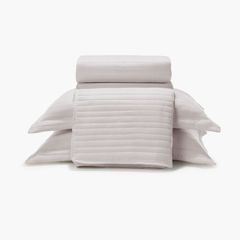 O conjunto é complementado por dois porta-travesseiros com quatro abas de 5 cm, que adicionam uma moldura de requinte e um toque final clássico à sua cama. Na cor Cinza Claro, este kit colcha traz a leveza, a tranquilidade e a modernidade que o seu quarto de casal merece.