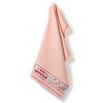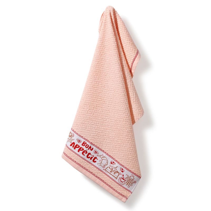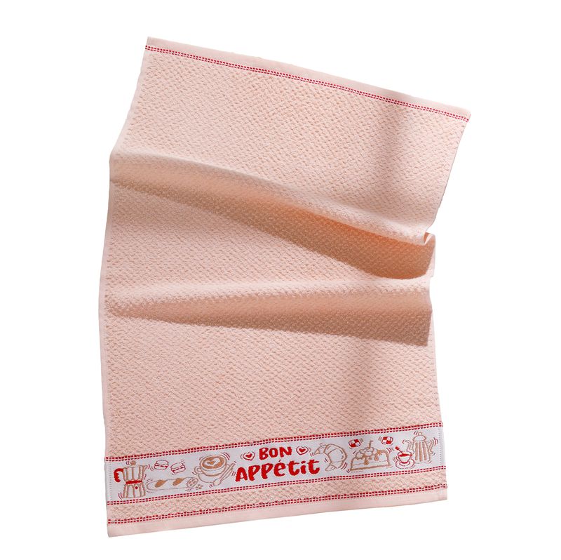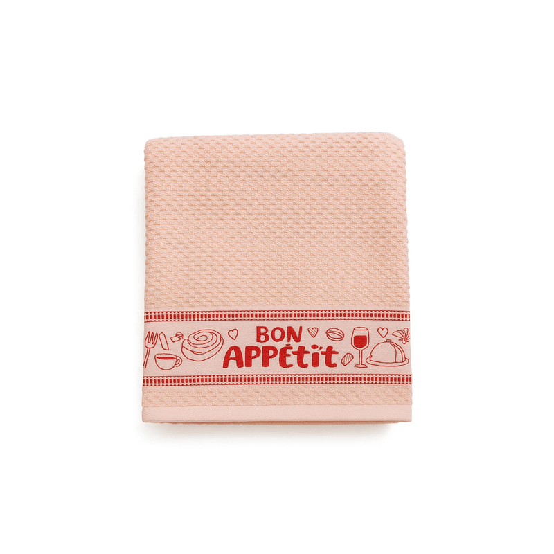 -85% Algodão, para maior absorção e resistência; -340g/m de gramatura; -Cor rosa, tecido felpudo e barra estampada Bom Appetit em jacquard; -Possui 1 (uma) peça no tamanho 45x70cm.