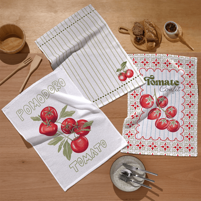 O Pano de Prato Döhler Tomate é a escolha perfeita para quem deseja uma cozinha vibrante e cheia de personalidade. Com estampas inspiradas no frescor das hortas, esta linha apresenta ilustrações ricas de tomates maduros, ramos verdes e padrões geométricos que remetem ao estilo "Pomodoro" e "Tomate Confit", trazendo um ar gourmet e alegre para o coração da sua casa.