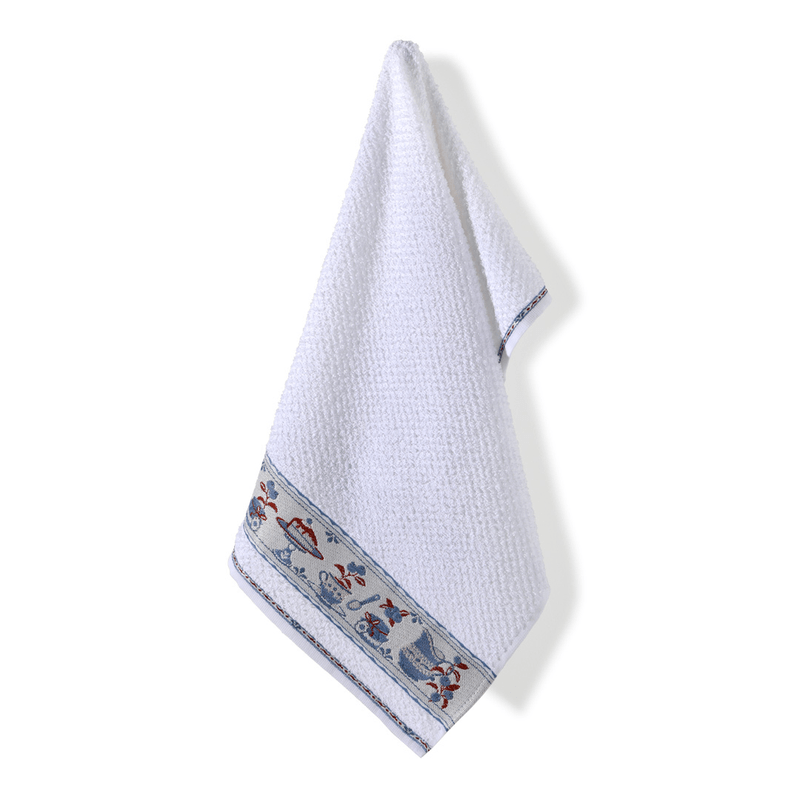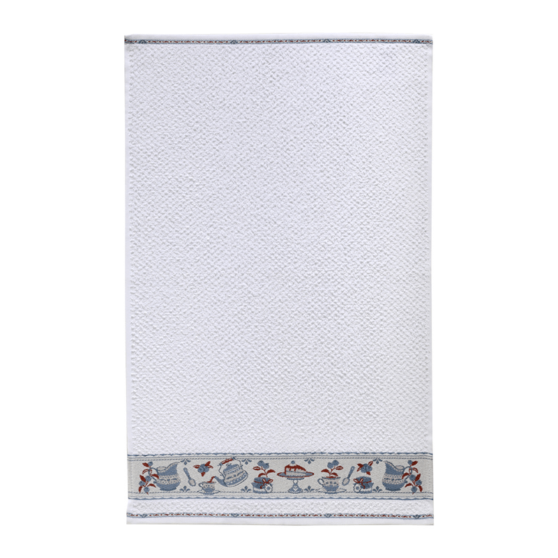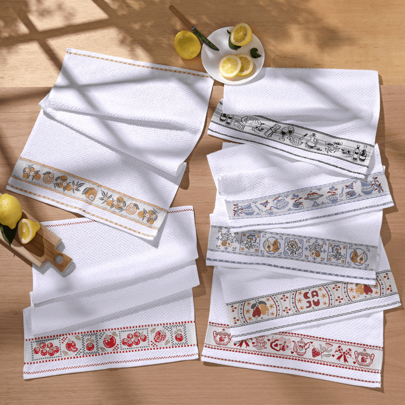 Confeccionado em tecido felpudo com uma composição mínima de 85% algodão e gramatura encorpada de 340 g/m², este pano de copa oferece uma capacidade de absorção superior, tornando a secagem de louças muito mais ágil e eficiente. O grande destaque é sua barra em Jacquard, uma técnica refinada onde os desenhos de bules, xícaras e elementos de confeitaria são trabalhados diretamente na trama do tecido, garantindo um visual em relevo elegante e com durabilidade excepcional.