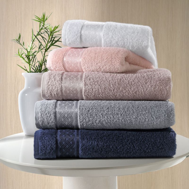 Com 400g/m de gramatura, ela é leve e eficiente, garantindo uma secagem rápida e confortável. A barra em jacquard com padrões detalhados adiciona um toque clássico e sofisticado, tornando esta toalha uma peça elegante para a sua decoração. Na toalha, "jacquard" se refere a um tipo de tecido onde desenhos e padrões intrincados são criados diretamente na tecelagem, resultando em um relevo texturizado em vez de serem impressos ou bordados.