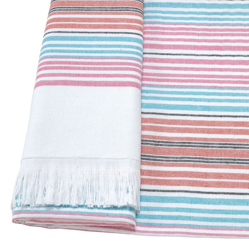 -Fabricada em 100% algodão, com a qualidade que só a Döhler pode proporcionar; -Sua gramatura de 340 g/m² garante uma textura leve e ao mesmo tempo resistente; -Envolve seu corpo com suavidade graças ao material em 100% algodão; -Apresenta padrão em tons praianos com listras. -A Toalha de Praia possui medidas de 90 cm de largura e 180 cm de comprimento.