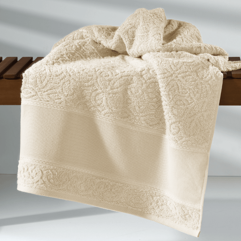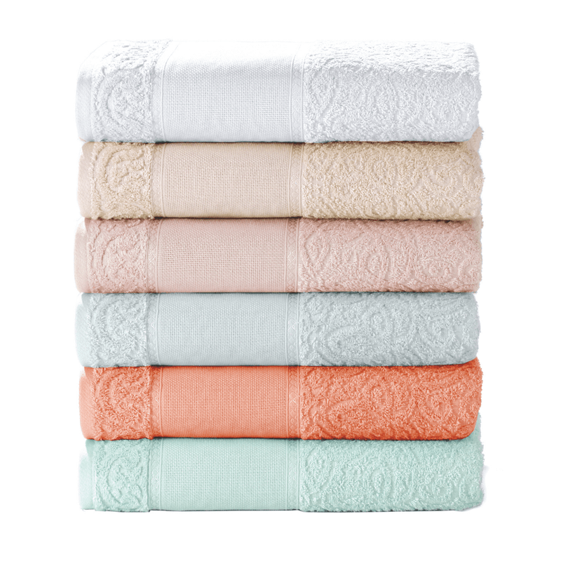 - Trama Jacquard: Toda a toalha é feita com este processo, que cria padrões sutis no tecido para um toque elegante.